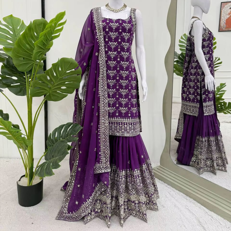 ชุดชาราร่าผ้าจอร์เจตต์สีม่วงหรูหรา ประดับเลื่อมและงานปักด้วยด้าย พร้อมผ้าคลุมไหล่