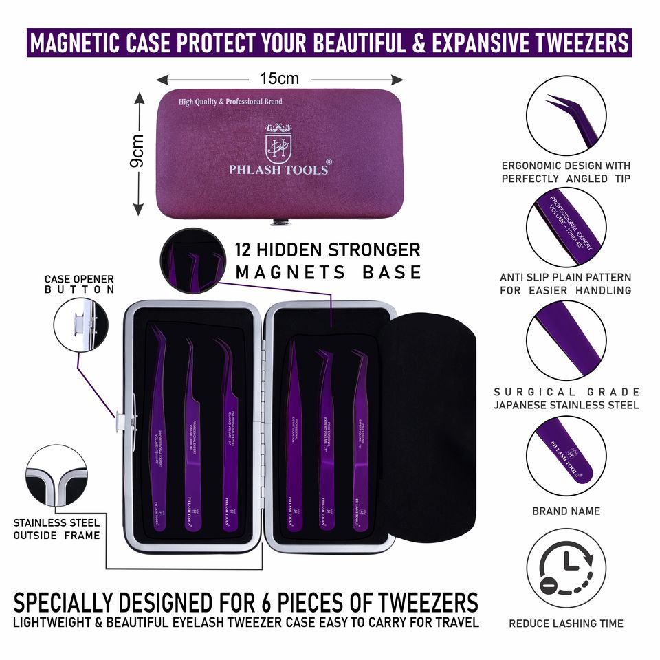 สีม่วงต่อขนตาสีม่วงแหนบชุด 6 ชิ้นพร้อมกรณีแม่เหล็กสีม่วงฉลากส่วนตัวคุณภาพสูงสแตนเลสแหนบ