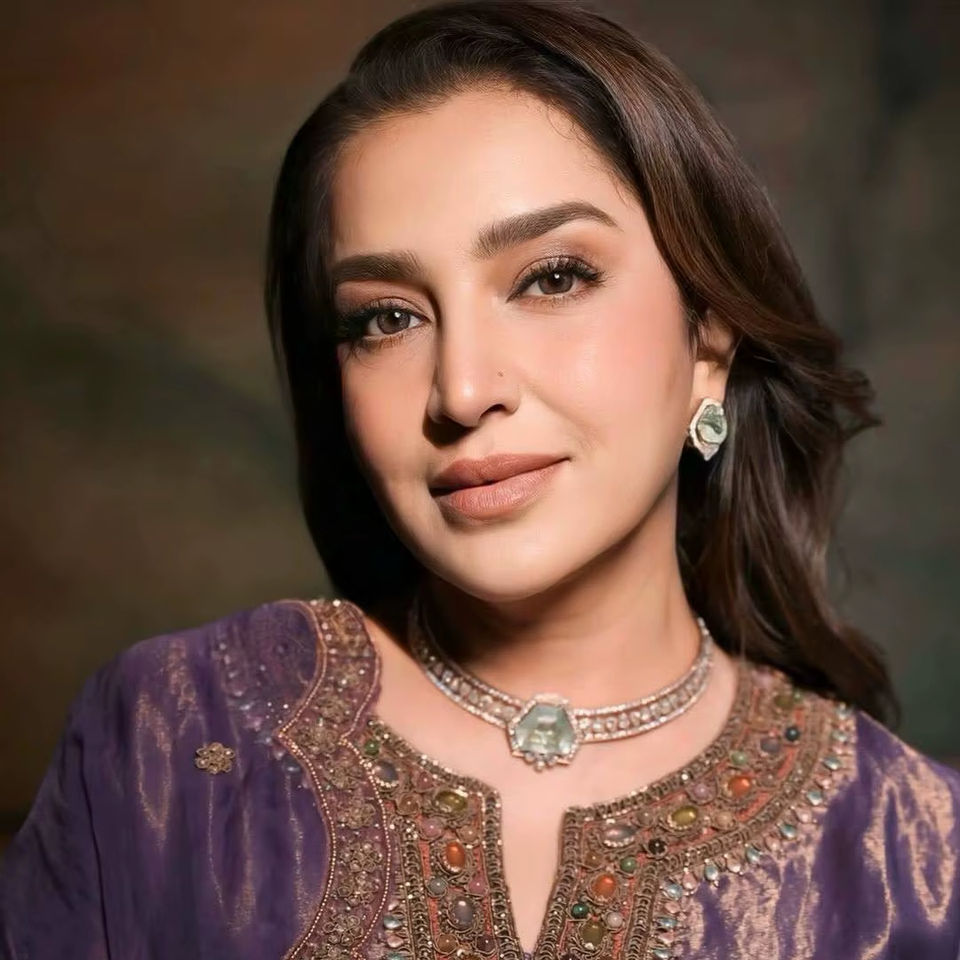ชุดคุर्ติผ้าไหมสีม่วงแบรนด์เฟนดี้ พร้อมกางเกงปาลาซโซ่ ผ้าคลุมไหล่ ประดับด้วยงานปักเลื่อม งานปักดิ้น งานปักด้าย และงานปักมือประดับด้วยหิน ชุดเสื้อปาลาซโซ่พร้อมผ้าคลุมไหล่