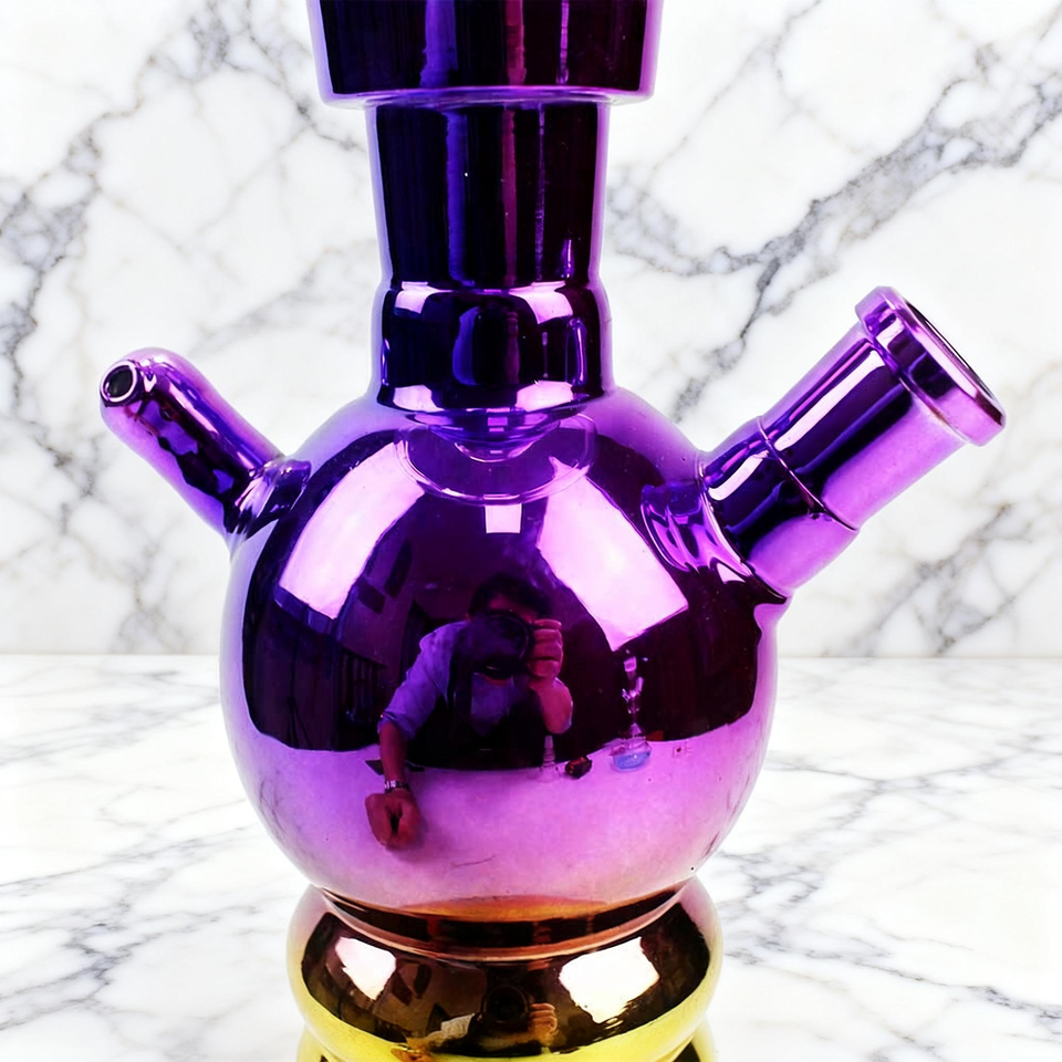 ชิชาฮุคคาโลหะไล่ระดับสีสีม่วง-เหลืองทอง-กระจกใสและท่อสีดำสำหรับใช้ในสังคมแบบลำลอง