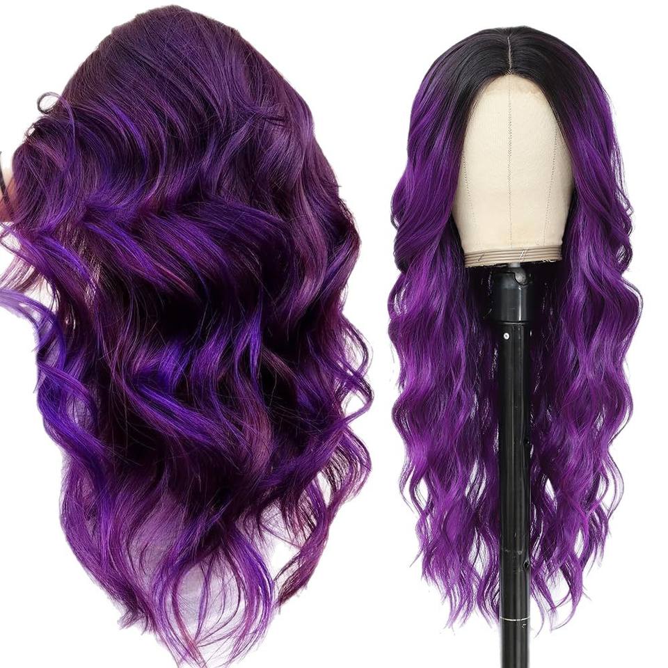 วิกผมยาวหยิกไล่เฉดสีม่วง 26 นิ้ว วิกผมสังเคราะห์ลอนน้ำ แบบเต็มศีรษะ เส้นผมธรรมชาติ ใยคาเนคาลอน วิกผมผู้หญิง