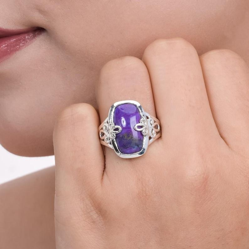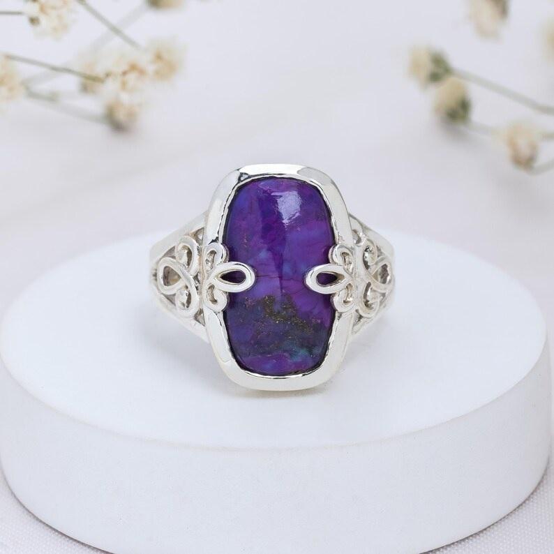 แหวนพลอยสีม่วงสีเทอร์ควอยส์สีเงินสเตอร์ลิงทำด้วยมือดีไซน์ไม่ซ้ำใครเครื่องประดับอัญมณีสไตล์โบฮีเมียนเหมาะกับชาวคริสต์