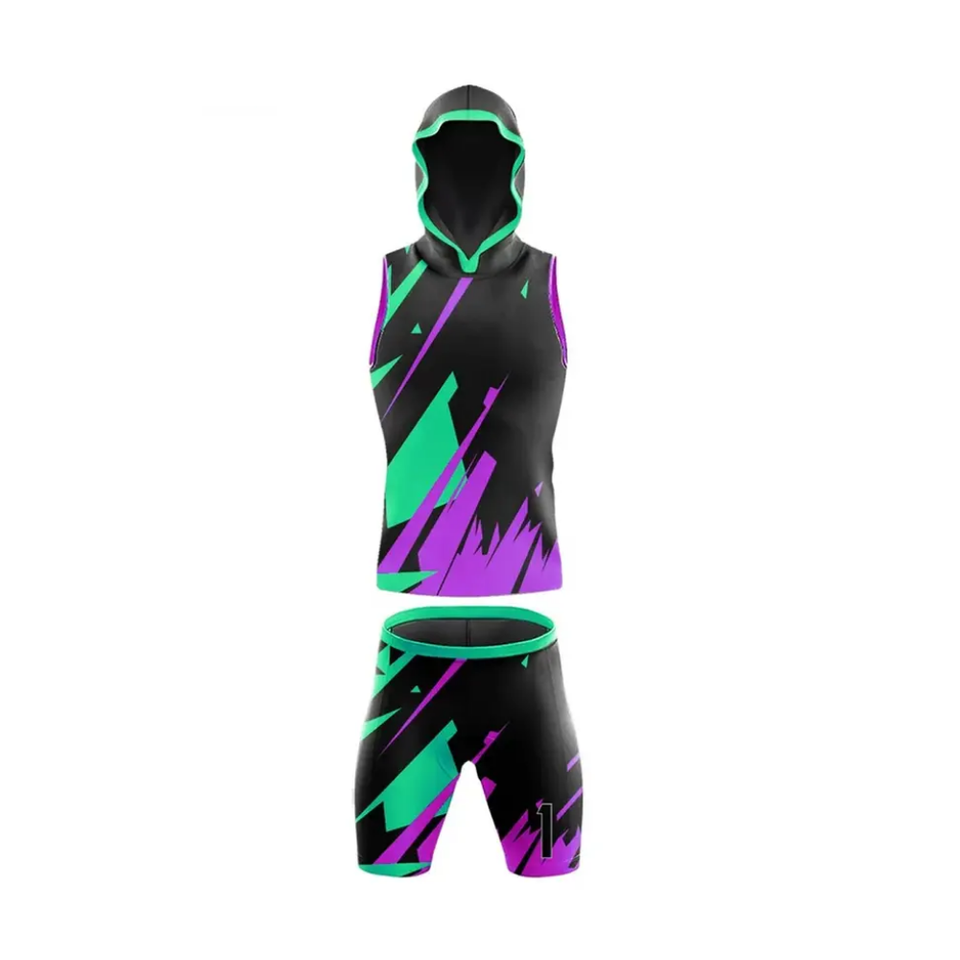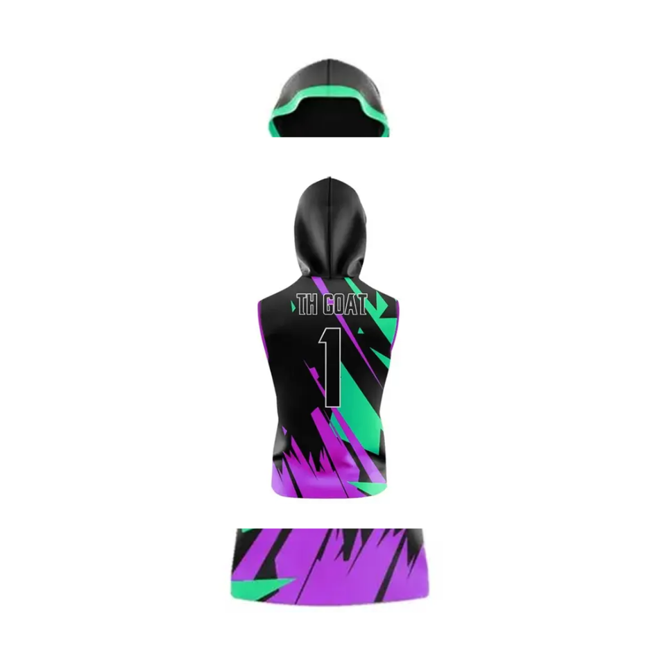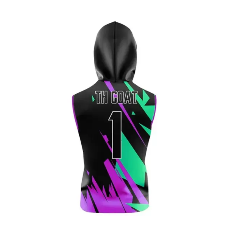 ชุดฟุตบอล 7 คน สีม่วงนีออน เสื้อฮู้ดแขนกุด ลายพิมพ์แบบซับลิเมชั่น ชุดทีมแบบกำหนดเองได้