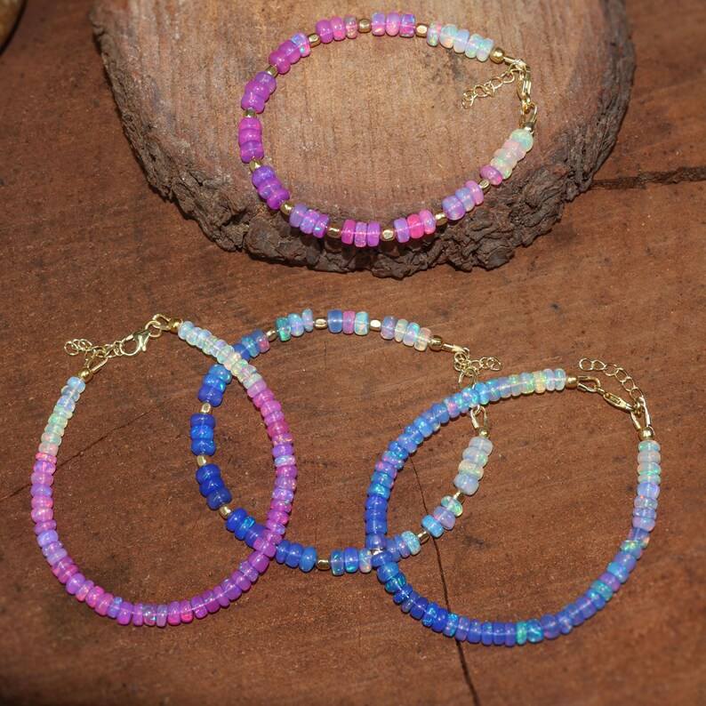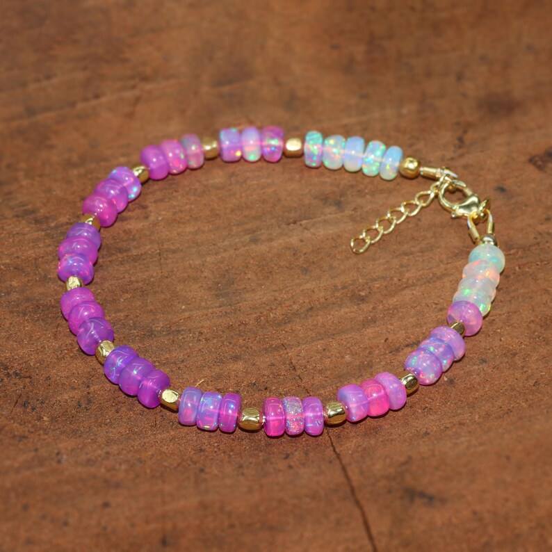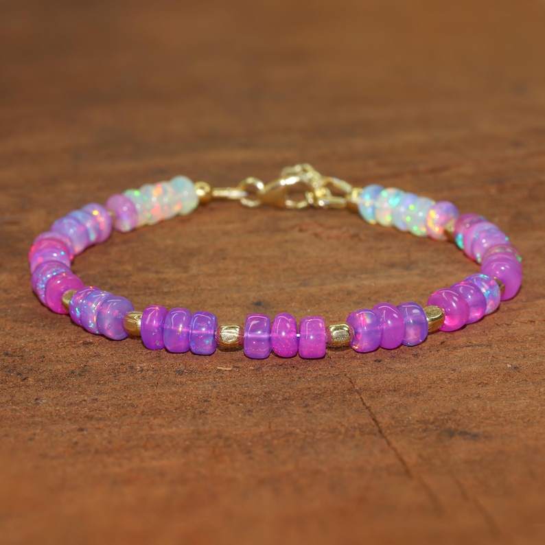 สร้อยข้อมือลูกปัดโอปอลสีม่วงพร้อมหินลูกปัดโอปอลสีม่วงสีรุ้ง