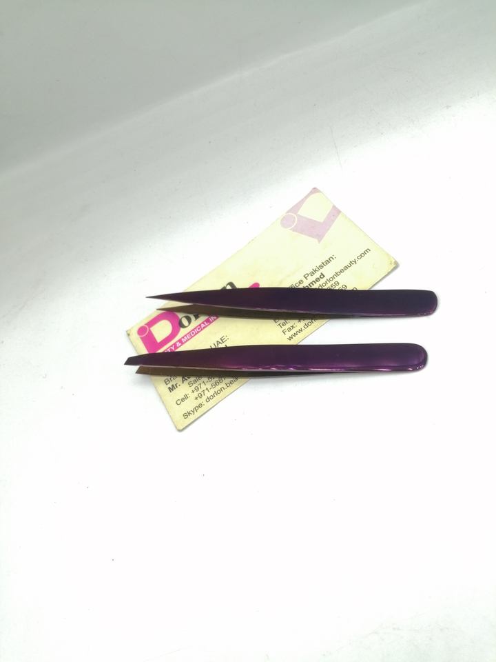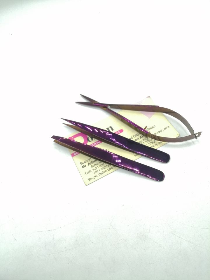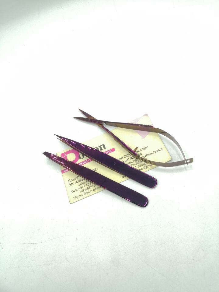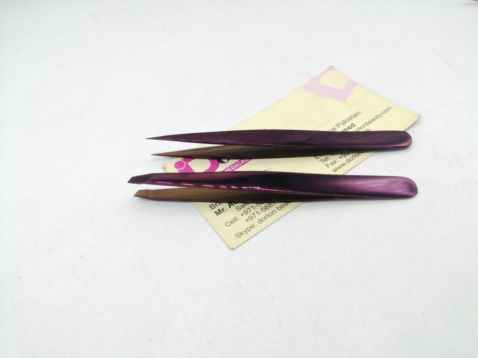 แหนบคิ้วพลาสม่าสีม่วงพร้อมแหนบปลายแหลมปลายกรรไกรแบบสปริงสั่งทำฉลากส่วนตัว