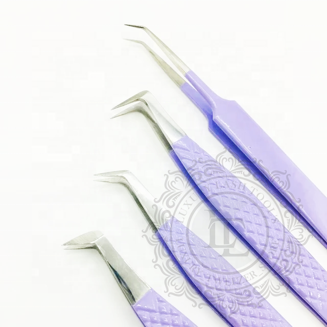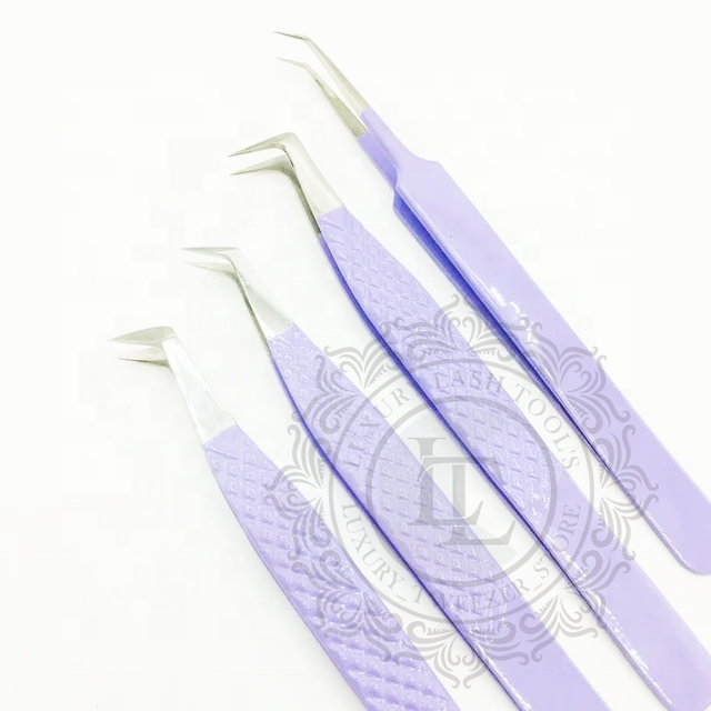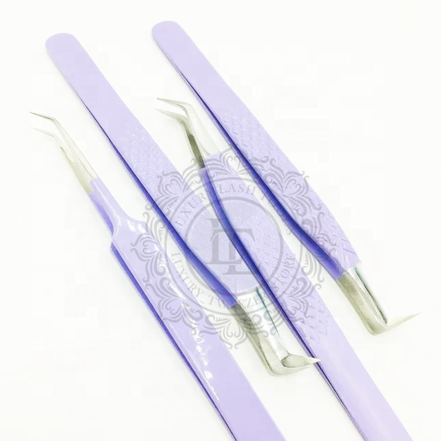 แหนบต่อขนตาด้ามเพชรสแตนเลสแบบยั่งยืนแหนบขนตาสีเงินเคลือบผงสีม่วง
