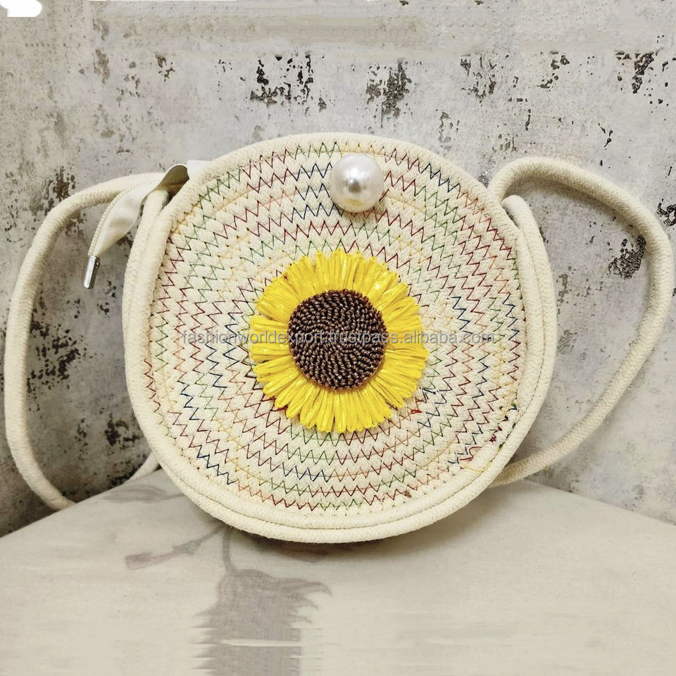 กระเป๋าสะพายข้างเชือกสีม่วงพร้อมดอกทานตะวันกระเป๋าโบโฮทรงกลมทำด้วยมือสำหรับเด็กผู้หญิงหรือผู้หญิงกระเป๋าสตางค์ลายดอกลาเวนเดอร์สีพาสเทลพร้อมรายละเอียดไข่มุก