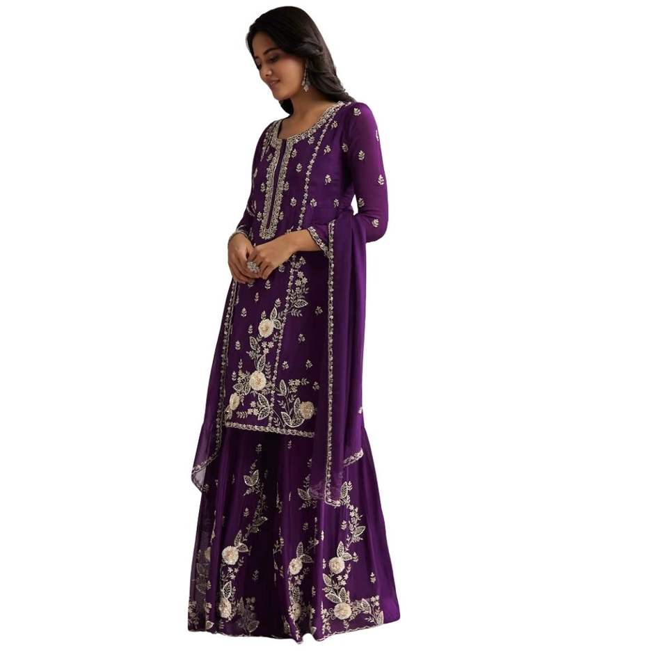 ชุดสูทพาลาซโซปักเลื่อมสีม่วงสำหรับผู้หญิงเสื้อผ้าชาติพันธุ์ผลิตตามแบบ