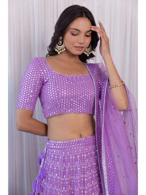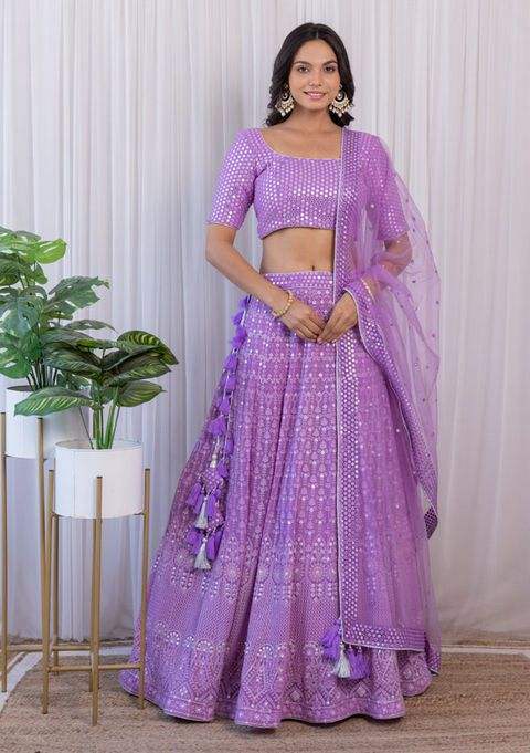 ชุดเลเฮนกาโชลีผ้าไหมผสมฝ้ายสีม่วงสำหรับงานปาร์ตี้ งานปักดิ้นทองสำหรับผู้หญิง