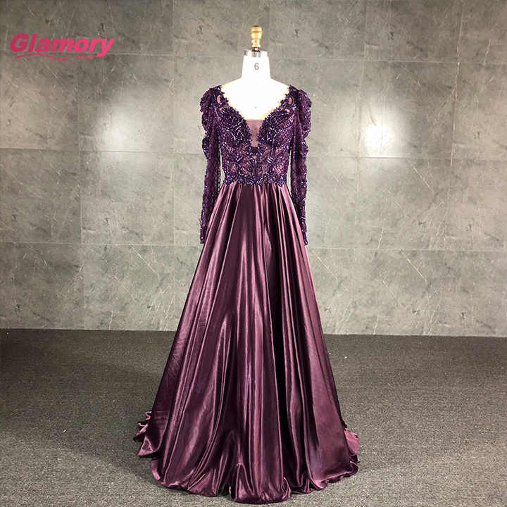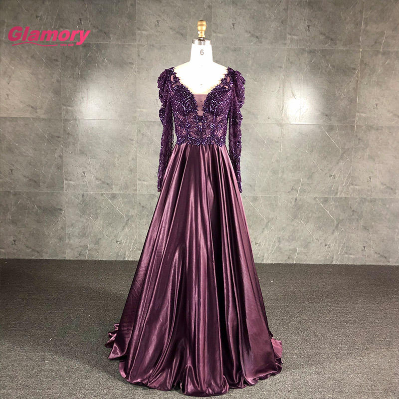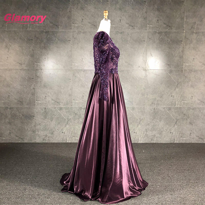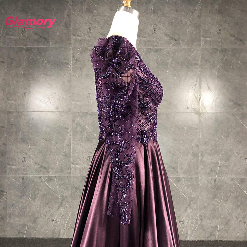 ชุดเดรสยาวสำหรับผู้หญิงอ้วนชุดเดรสผ้าซาตินทรงเอไลน์แขนสีม่วงสุดหรูสำหรับงานราตรี