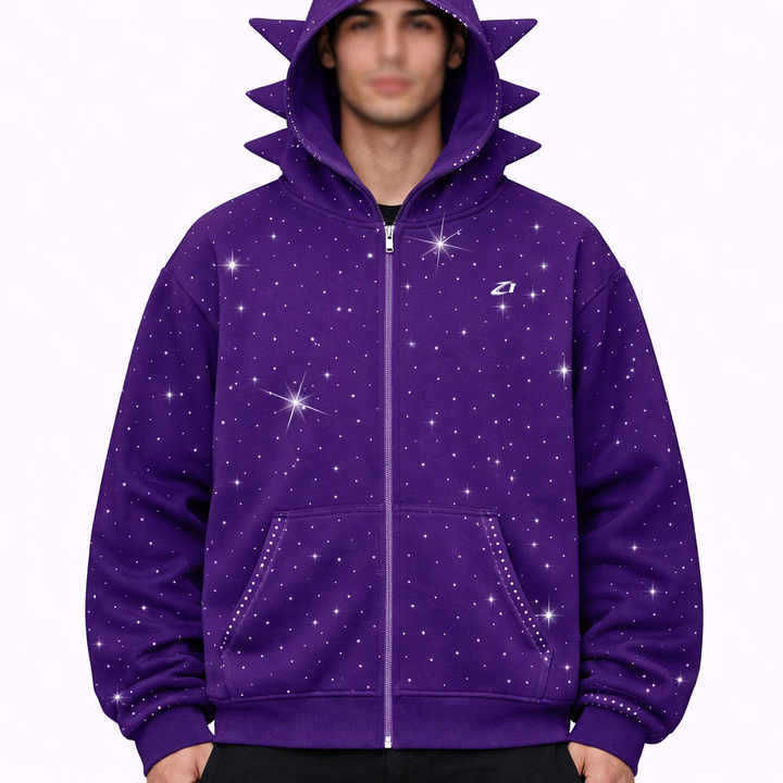 เสื้อฮู้ดผู้ชายสีม่วงประดับคริสตัลแบบซิป ทรงโอเวอร์ไซส์ ผ้าฝ้ายฟลีซ สตรีทแวร์ หนานุ่ม ระบายอากาศได้ดี เหมาะสำหรับฤดูหนาว ผลิตโดยโรงงาน OEM