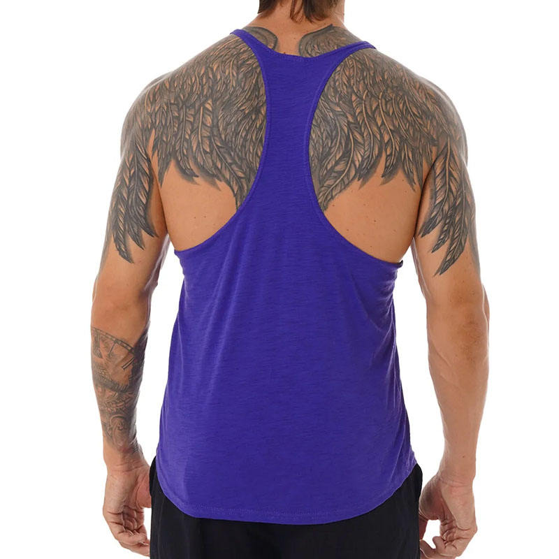 เสื้อกล้ามสตริงเกอร์สีม่วงสำหรับผู้ชายเสื้อกล้ามเพาะกายทำจากผ้าฝ้าย100% ทรงหลวมเสื้อใส่ไปยิมฟิตกล้ามเนื้อออกแบบโลโก้ได้ตามต้องการ