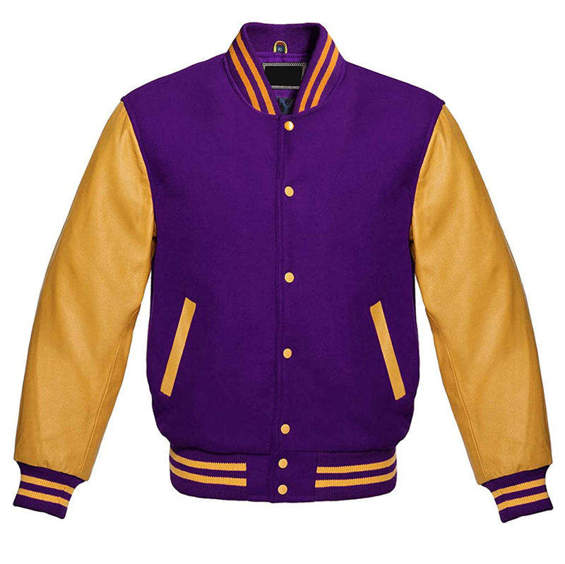 Purple Varsity Jacket Yellow Sleeves Men's Unisex Baseball Style Stand Button Rib Trim Custom Logo Option Warm Breathable