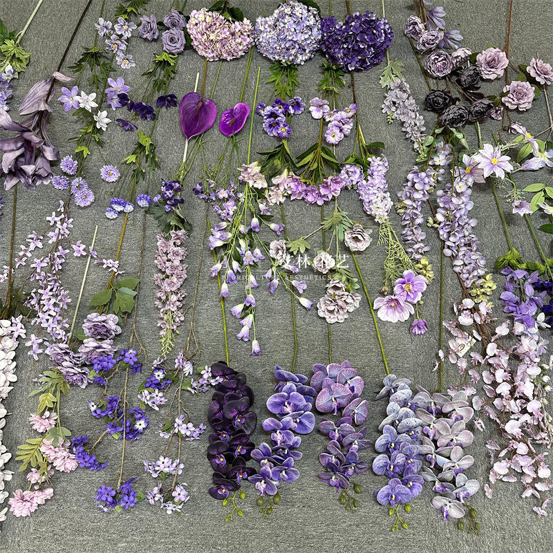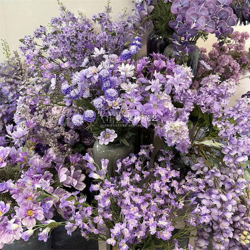 ดอกไฮเดรนเยียประดิษฐ์สำหรับงานแต่งงานสีม่วงการจัดหมอกเพดานและใบไม้ทำจากพลาสติกตกแต่งผนังทรงบอล