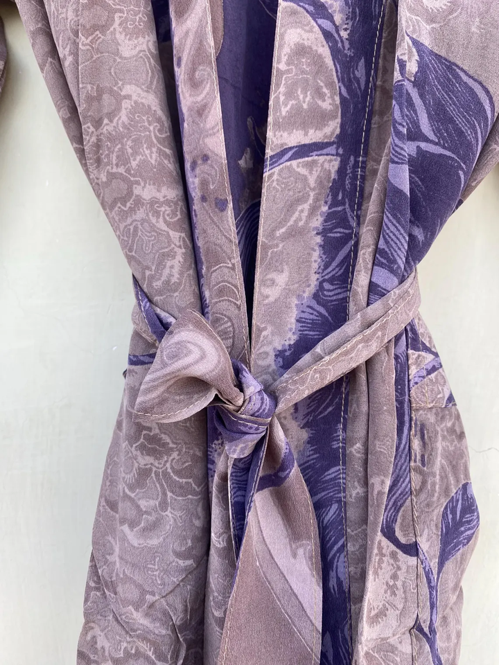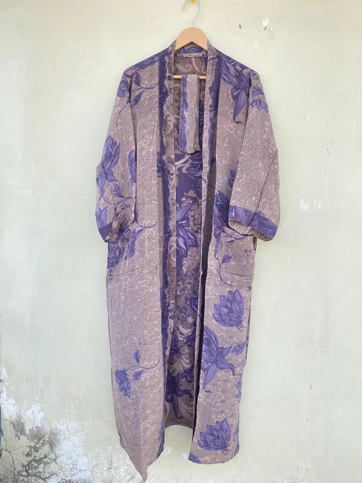 ชุดคลุมกิโมโนผ้าไหมสำหรับผู้หญิงวินเทจชุดคลุมผ้าไหมสีม่วงและสีเทา