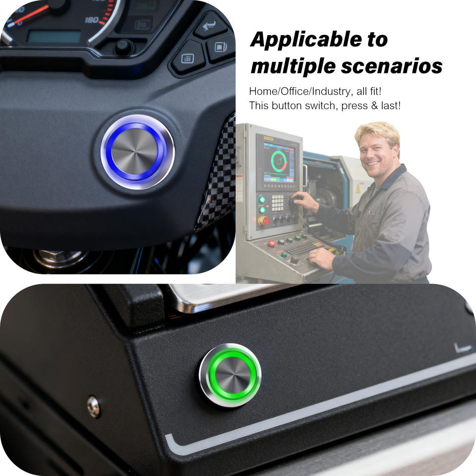 สวิตช์ปุ่มกดแบบกดติดปล่อยดับ 1NO 1NC สแตนเลส 16 มม. พร้อมวงแหวนไฟ LED สีฟ้า สำหรับแผงควบคุม 12V 24V