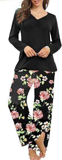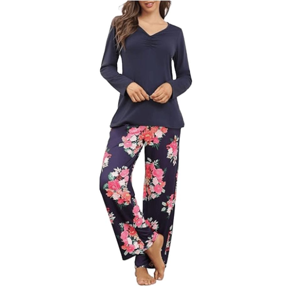 ชุดนอนผ้าฝ้ายแขนยาวสำหรับผู้หญิงชุดอยู่บ้านลำลองมีกระเป๋าชุดนอนแต่งระบายคอวี