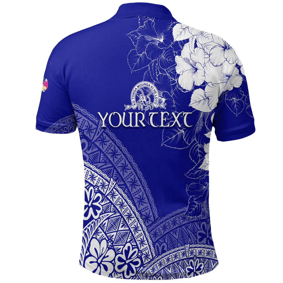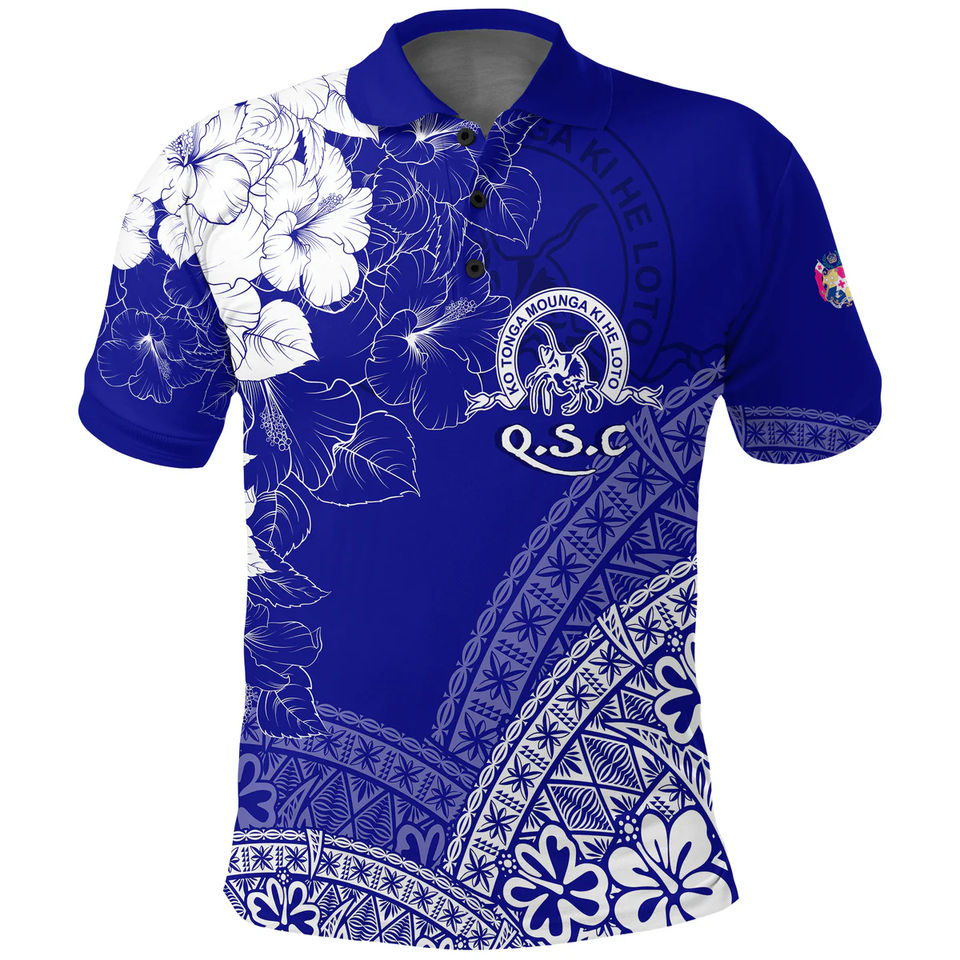 คิว.เอส.ซี. เสื้อโปโลแขนสั้นติดกระดุมลายโพลินีเซียนสีน้ำเงินรอยัล ฮิบิสคัส ของทงกา มอนจ์ คิ ฮี โลโต พร้อมตราประจำชาติ