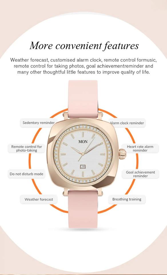 โครโนกราฟ, เครื่องวัดอุณหภูมิ, นาฬิกาปลุก, รีโมทคอนโทรล, เครื่องติดตามการนอนหลับ, เครื่องติดตามสุขภาพ, การแจ้งเตือนการโทร, ข้อความแจ้งเตือนแบบพุช, อัตราการเต้นหัวใจติดตาม, กิจกรรมติดตาม, สังคมสื่อการแจ้งเตือน, เครื่องนับก้าว, เครื่องวัดลมหายใจ, เครื่องติดตามกีฬาหลายประเภท, ที่เตือน, การจัดการประจำเดือนฟังก์ชัน