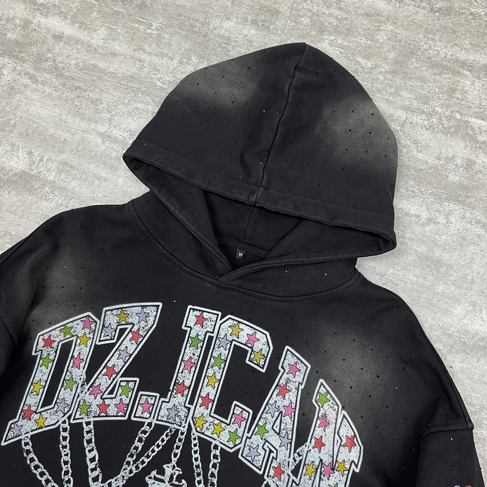 เสื้อฮู้ดดี้ผู้ชาย QIANSHI พิมพ์ลายกราฟิก ผ้าเฟรนช์เทอร์รี่ 600 กรัม ทรงหลวม ไหล่ตก สำหรับฤดูหนาว ผ้าฝ้าย 100% ประดับด้วยคริสตัลและลายกราฟิกแบบกรด