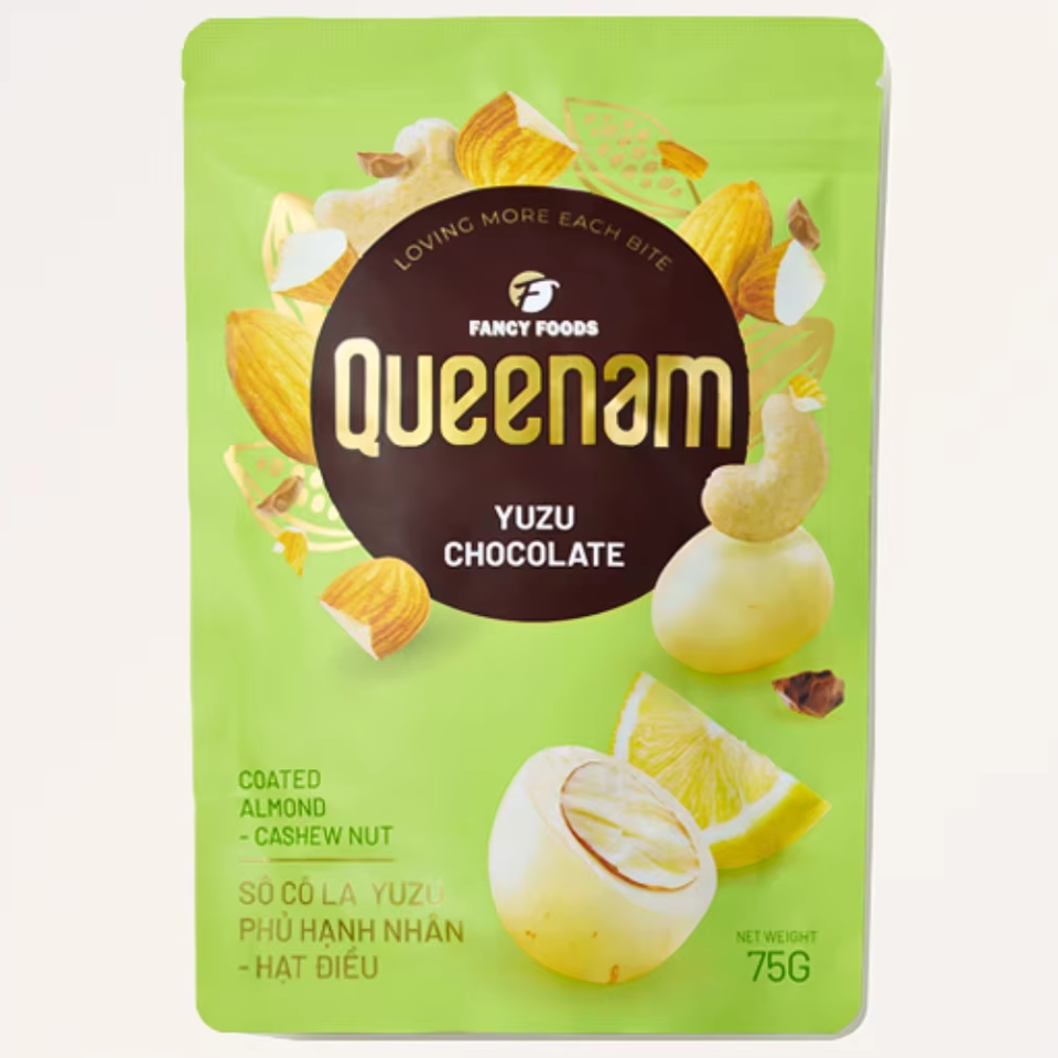 Queenam เม็ดมะม่วงหิมพานต์อัลมอนด์75กรัมเคลือบช็อคโกแลตฮาลาล OEM Yuzu ราคาขายส่งจากเวียดนาม