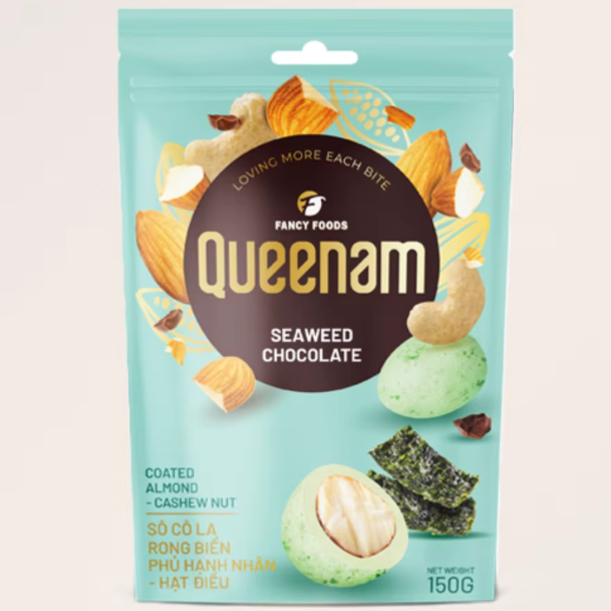 Queenam ช็อกโกแลตรสอัลมอนด์เม็ดมะม่วงหิมพานต์เคลือบสาหร่ายฮาลาลจากเวียดนาม150กรัม