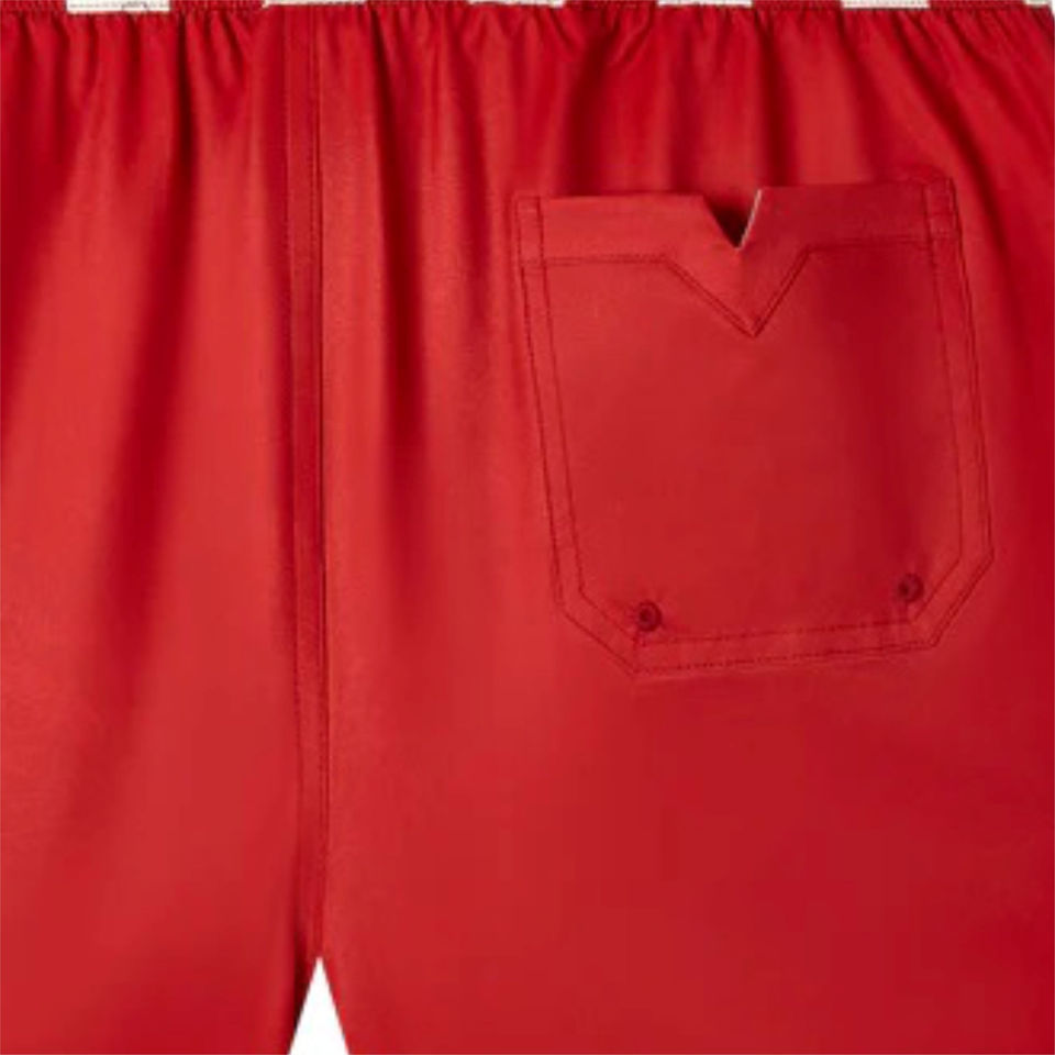กางเกงว่ายน้ำผู้ชายผ้าลูกฟูกแห้งเร็ว พร้อมโลโก้ปักแบบกำหนดเอง ขอบเอวสีแดงล้วน ระบายอากาศได้ดี