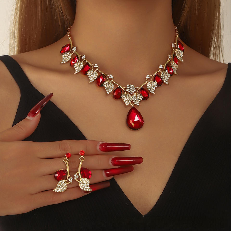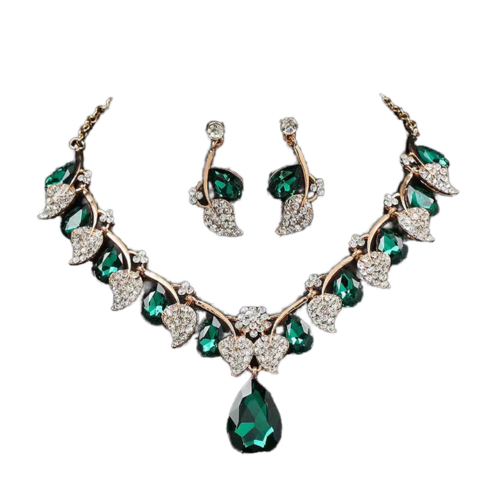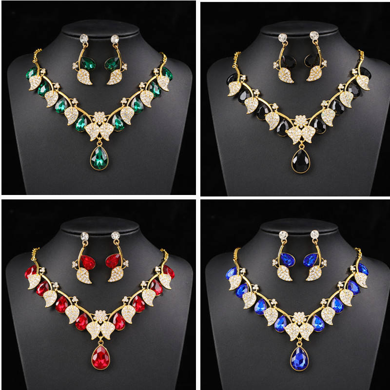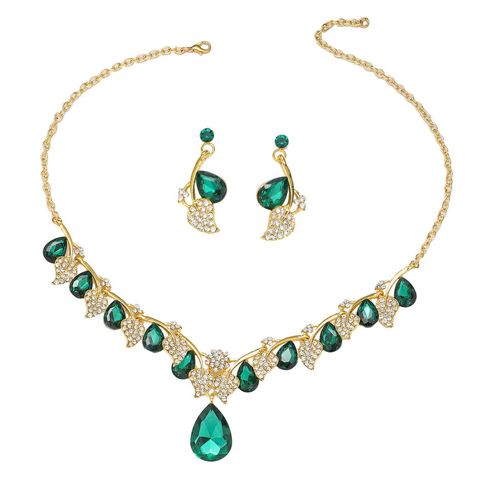 QX Elegant Luxury Trendy Crystal Rhinestone Droplet Necklace Earring Set Gold Plated Leaf Collar Chain Wedding Party Engagement