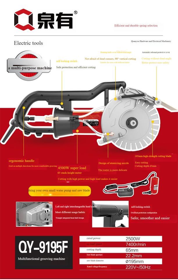 QY-9195F 65mm Deep Cut, with Water Pump and Interchangeable Heads, for Stone/Ceramic Tile 2500W Professional Grooving Machine