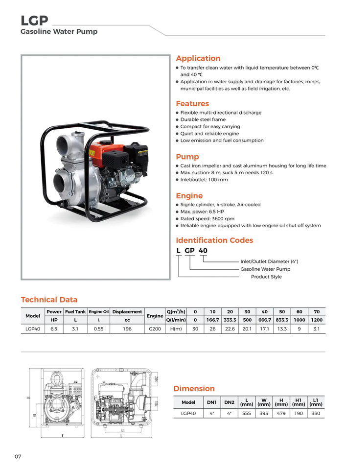 QY ปั๊มน้ำขับเคลื่อนด้วยเครื่องยนต์เบนซินสำหรับการรดน้ำในพื้นที่อยู่อาศัยการทำงานที่เงียบ LGP40