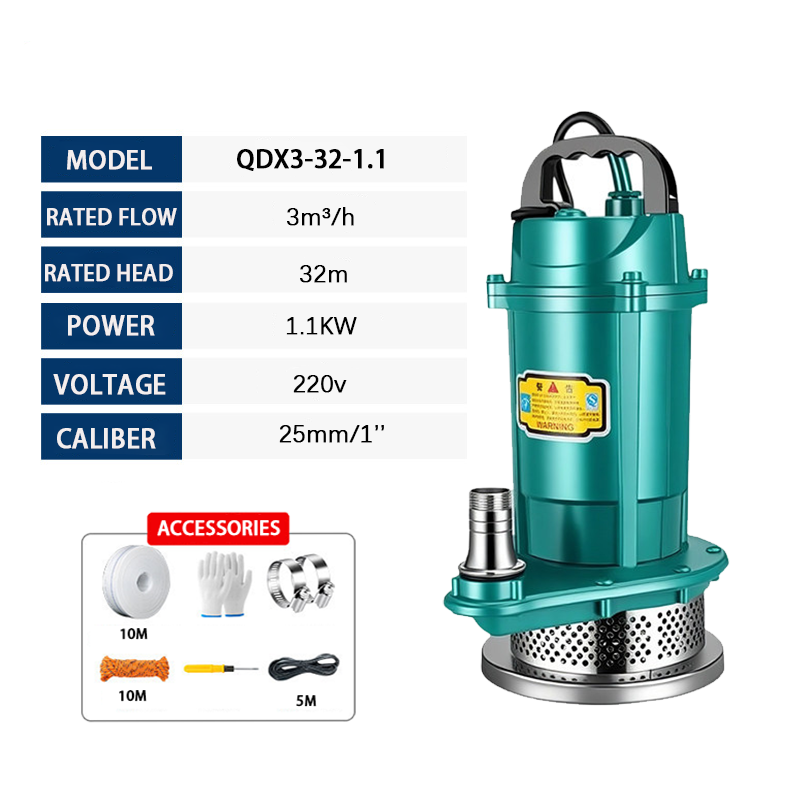 ปั๊มจุ่มใต้น้ำ QY QDX3-32-1.1 กำลังไฟ 1.1 กิโลวัตต์ อัตราการไหล 3 ลูกบาศก์เมตร/ชั่วโมง ระยะส่งน้ำ 32 เมตร แรงดันสูง ผลิตจากอะลูมิเนียมหล่อขึ้นรูป สำหรับงานขุดลอกบ่อและดูดตะกอน