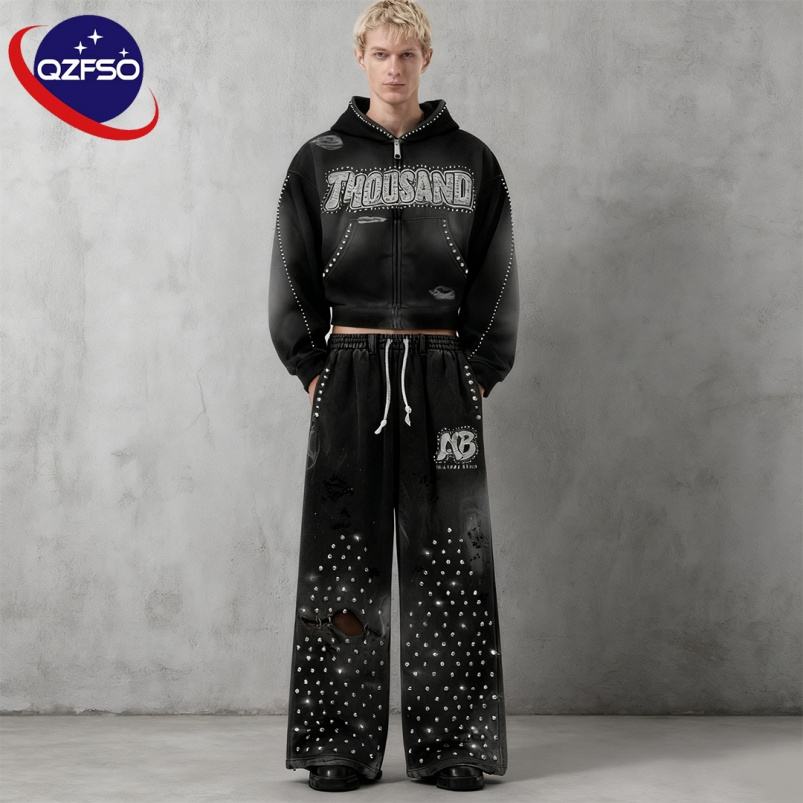 QZFso ชุดวอร์ม2ชิ้นสำหรับผู้ชายชุดวิ่งจ๊อกกิ้งลายกราฟิก rhinestone ชุดวอร์มและเสื้อมีฮู้ด