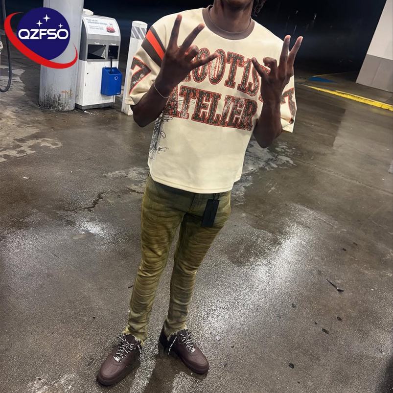 QZFso เสื้อยืดผู้ชายวินเทจ320กรัม, เสื้อยืดผู้ชายผ้าฝ้ายซักกรดพิมพ์ลายดิจิตอลโอเวอร์ไซส์100% ครอป