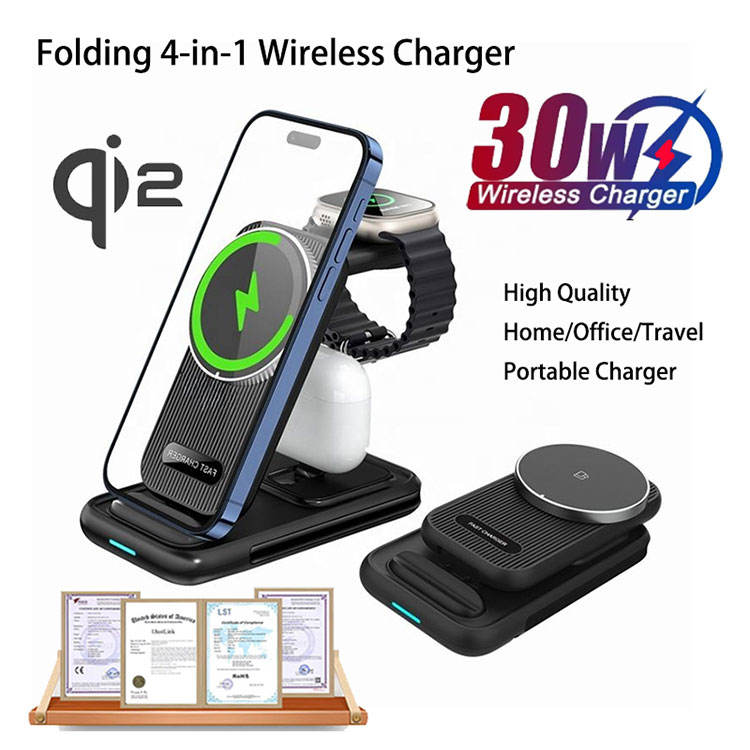 ที่ชาร์จไร้สาย Qi 2.2 4 in 1 แบบพับได้ สำหรับ Samsung Xiaomi Iphone 15 Pro Max พร้อมแท่นชาร์จ
