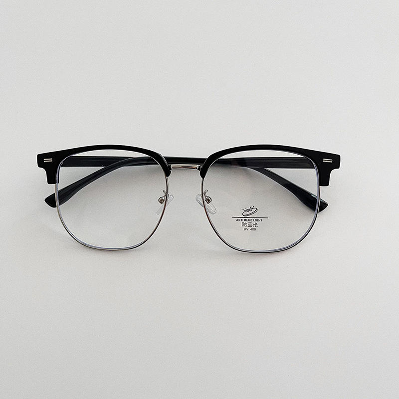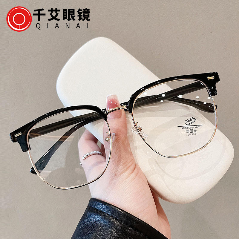 กรอบแว่นตาครึ่งกรอบ Qianai สำหรับผู้ชาย ทรงกว้าง ป้องกันแสงสีฟ้า ทรงเหลี่ยมไม่สมมาตร พร้อมหมุดยึด กรอบแว่นสายตา