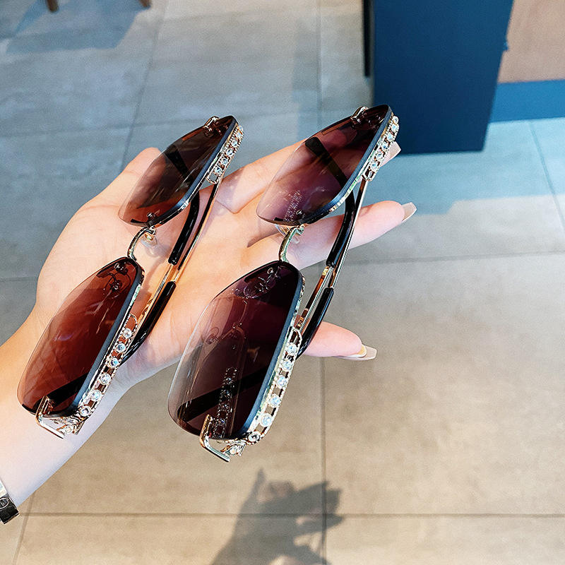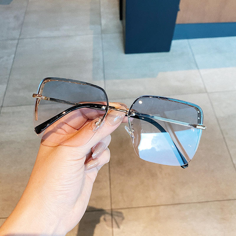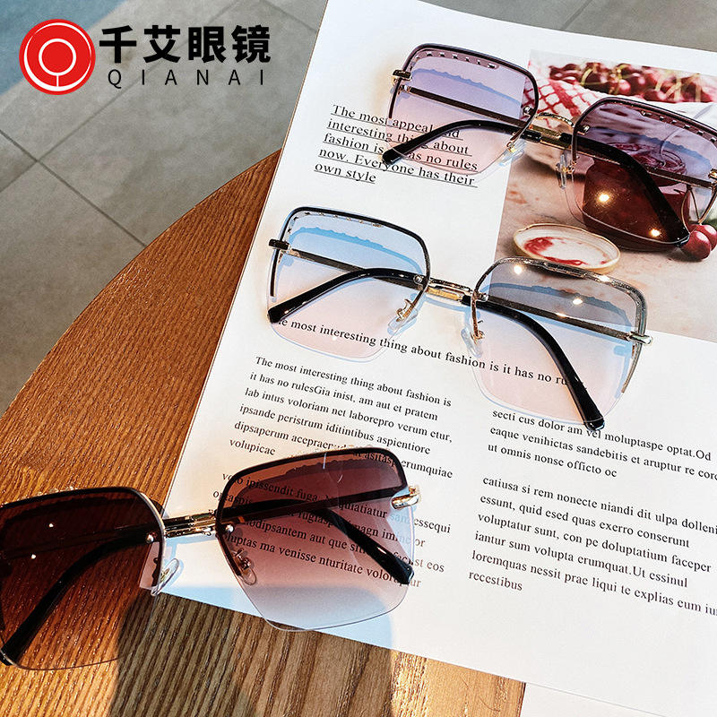 แว่นกันแดดครึ่งกรอบสำหรับผู้หญิง Qianai ป้องกันรังสียูวี 400 กรอบโลหะ ดีไซน์ทรงสี่เหลี่ยม สีเทา สีฟ้า สีชมพู สีม่วง สีทอง เลนส์อะคริลิก