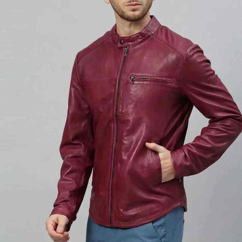 แจ็กเก็ตหนังวัวแท้สำหรับผู้ชายเสื้อแจ็กเก็ตสำหรับนักขี่จักรยานสีแดงมีกระเป๋าสองข้างแบบดั้งเดิม