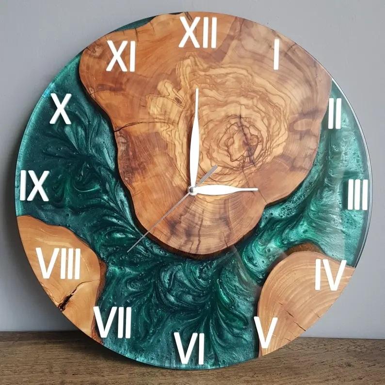 นาฬิกาแขวนผนังทรงกลมทำจากไม้เรซินแอนะล็อกควอตซ์พร้อมเข็มเงียบมาตรวัดความชื้นดีไซน์ทันสมัยสำหรับแขวน