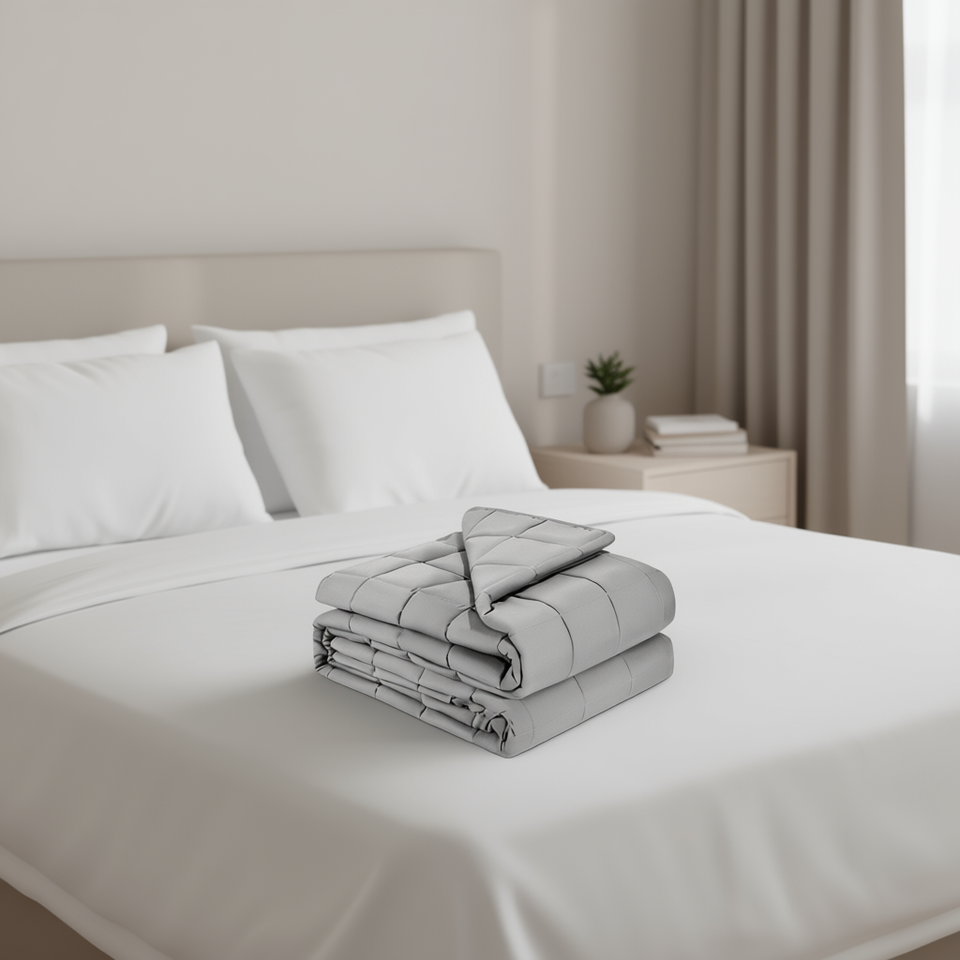 ผ้าห่มถ่วงน้ำหนัก ขนาดควีนไซส์ 25 ปอนด์ 60 x 80 นิ้ว บรรจุเม็ดแก้ว 100% ผ้าฝ้ายเย็บติดกัน ระบายอากาศได้ดี ใช้สำหรับเตียง