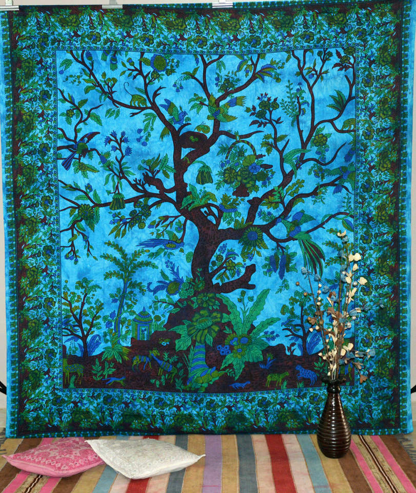 Queen Size Bedspread Tree Of Life Blue Color Tapestries Beautiful Cotton Wall Hanging Handmade Home Decor By Indian Consigners