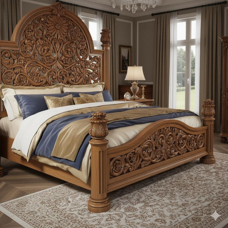 Queen-Size Midcentury Style Mahogany Bed with Hand Carvings & Excellent Finish for Bedroom Set Home Furniture
