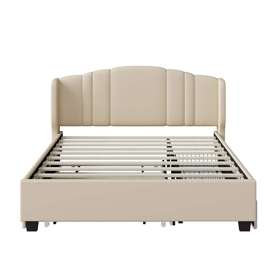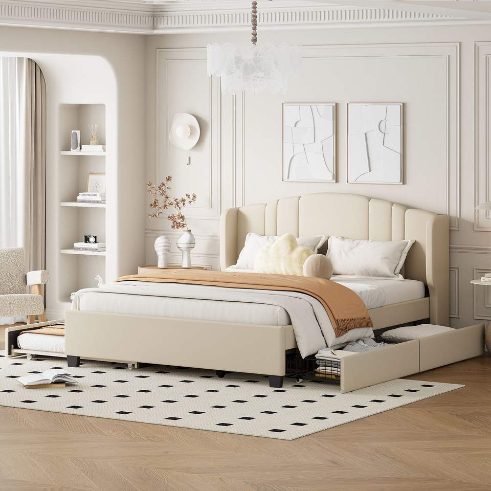 เตียงแพลตฟอร์มหุ้มเบาะขนาดควีนไซส์ พร้อมหัวเตียงแบบวิงแบ็ค และเตียงเสริมแบบคู่ 2 ลิ้นชัก ผ้าลินิน ไม่ต้องใช้ฐานรองเตียง