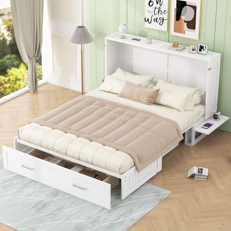 เตียงเมอร์ฟี่มือถือสีขาวขนาดควีนไซส์พร้อมลิ้นชักและชั้นวางเล็กๆในแต่ละด้าน