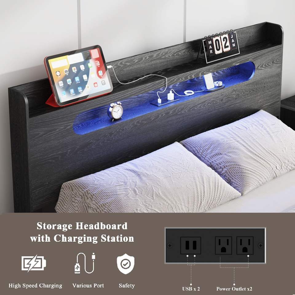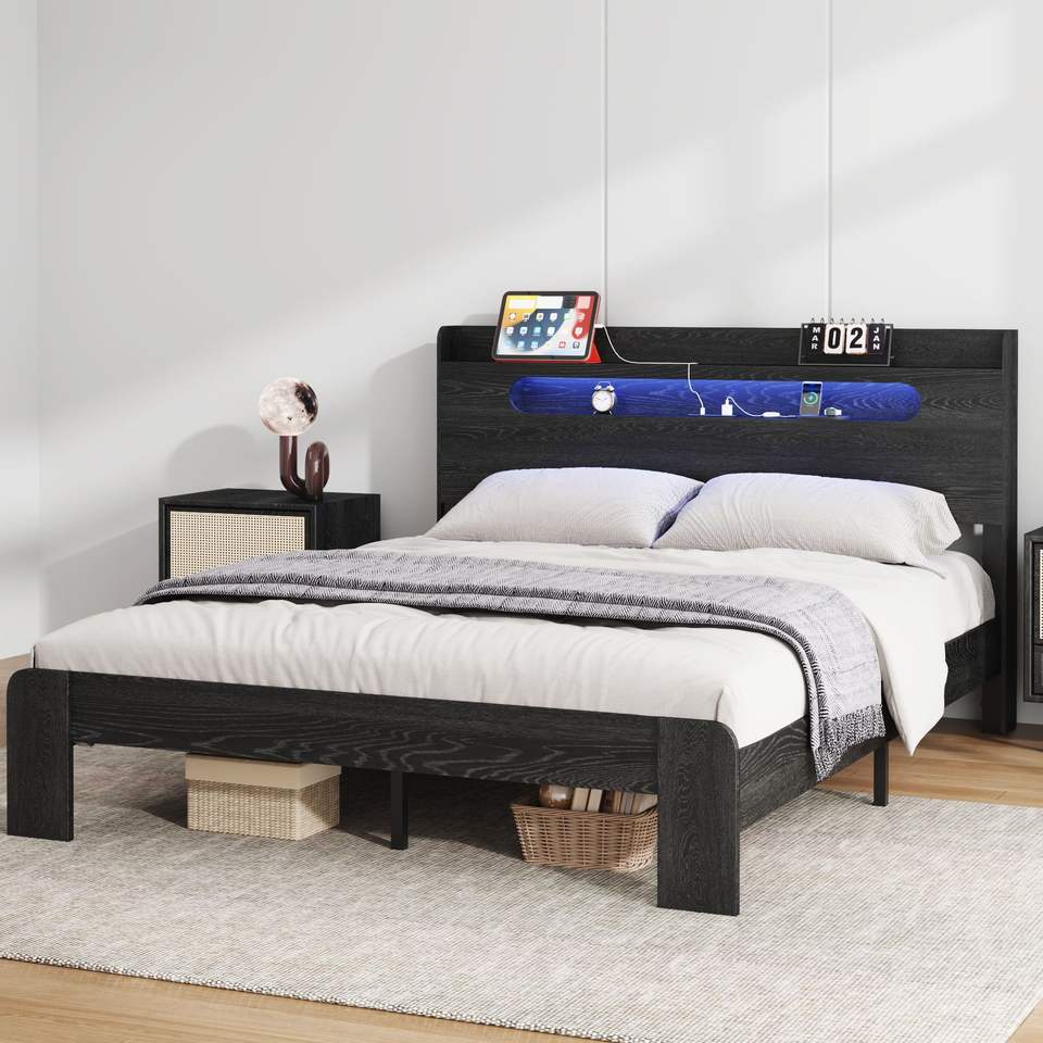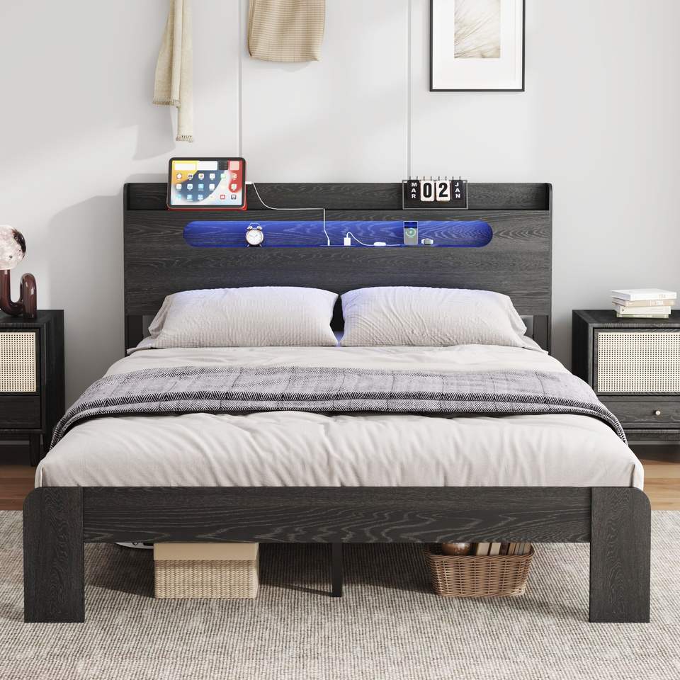 โครงเตียงไม้ขนาดควีนไซส์พร้อมไฟ LED ที่หัวเตียงและที่เก็บของ ช่องเสียบ USB 2 ช่อง ไร้เสียงรบกวน ไม่ต้องใช้บ็อกซ์สปริง