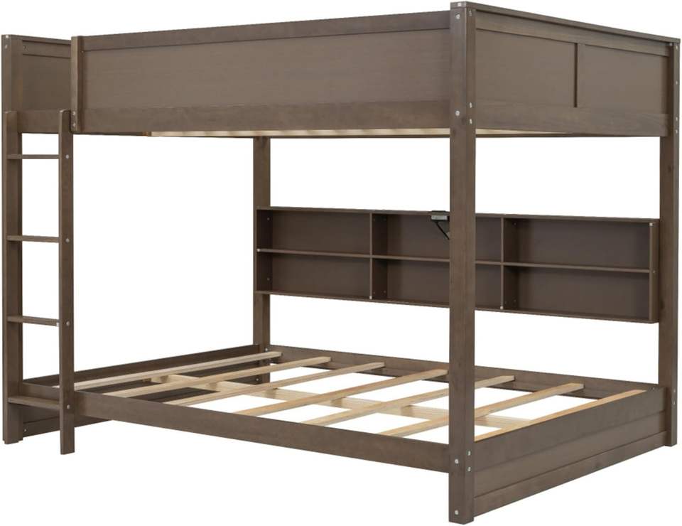 เตียงสองชั้น MDF ไม้จริงขนาดควีนไซส์พร้อมตู้เก็บของ6ตู้ไม่มีกล่องสปริงต้องการราวนิรภัยและสถานีชาร์จที่สะดวก