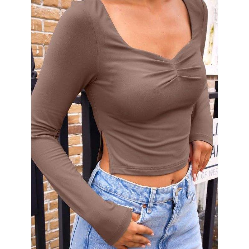 เสื้อครอปแขนยาวสำหรับผู้หญิง Queen Y2K น่ารักเดรสลำลองผ่าข้างคอลึกสั่งตัด
