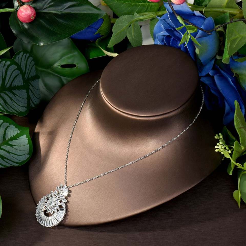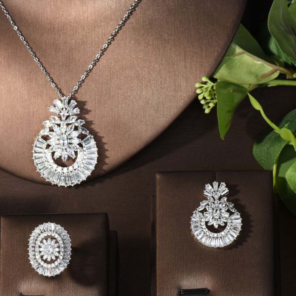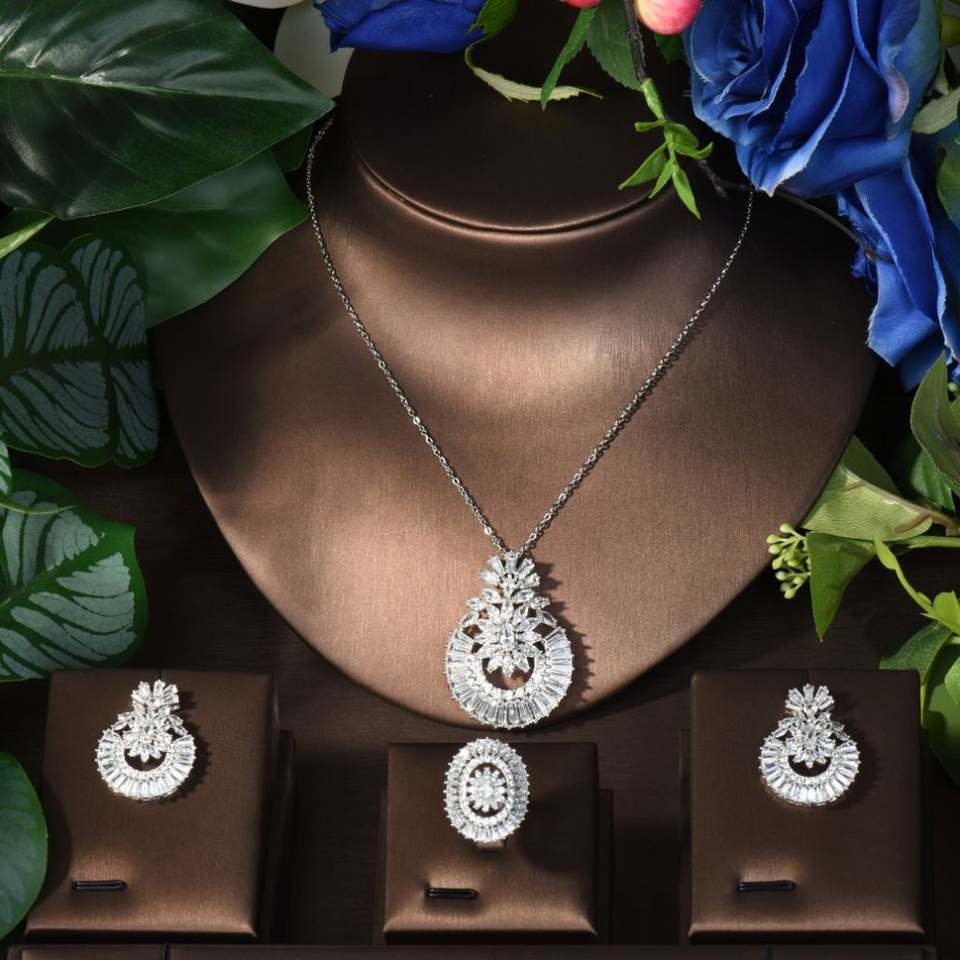 ราชินีแห่งความสง่างาม Zirconia ตารางเครื่องประดับที่งดงาม3ชิ้นต่างหูสร้อยคอเครื่องประดับเจ้าสาวอุปกรณ์ S-68งานแต่งงาน