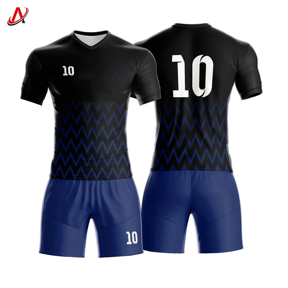 ชุดกีฬาฟุตบอลแบบแห้งเร็ว ระบายอากาศได้ดี ผลิตจากโพลีเอสเตอร์ 100% สีตามสั่ง พร้อมออกแบบชื่อทีมและชุดเสื้อและกางเกงขาสั้น