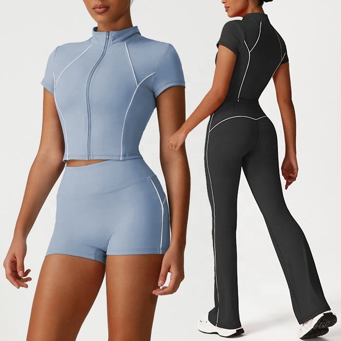 ชุดออกกำลังกายผู้หญิง 3 ชิ้น แห้งเร็ว ระบายอากาศดี เสื้อแจ็คเก็ตแขนยาว กางเกงเลกกิ้งรัดรูป สปอร์ตบรา เหมาะสำหรับโยคะ ฟิตเนส ออกกำลังกาย ดีไซน์ด้านหน้า