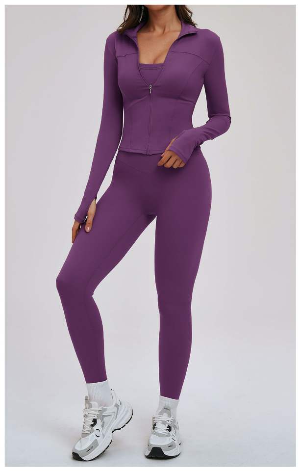 ชุดออกกำลังกายผู้หญิง 3 ชิ้น แห้งเร็ว ระบายอากาศดี เสื้อแจ็คเก็ตแขนยาว กางเกงเลกกิ้งรัดรูป สปอร์ตบรา เหมาะสำหรับโยคะ ฟิตเนส ออกกำลังกาย ดีไซน์ด้านหน้า